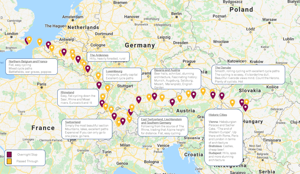 Of course, once I descending from the alpine heights of Oberalppass, in the heart of the beautiful Swiss Alps, I realised I wasn’t ready to head home just yet, and decided to head East. Still then, I had little idea the trip would morph into a 10 country epic through: The UK, France, Belgium, Luxembourg, Germany, Switzerland, Liechtenstein, Austria, Slovakia, Hungary, that I’d cover 2400km, visit a host of incredible places (Strasbourg, Mons, Ypres, Basle, Lucerne, Munich, Salzberg, Vienna, Bratislava, Budapest to name a few), and have so many wonderful (and challenging!) experiences.