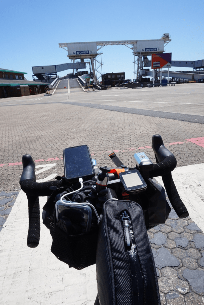 I’m starting my trip in Folkestone, a nondescript town on England’s South Coast. From there it’s a hilly, but short hop across to Dover to board the ferry and start the trip proper. A brief test period to ensure everything is in working order before I’m an ocean away from the comforts of home. In the current Covid-climate I’m reticent and half expecting to be turned back. We’ve been told we’re OK to travel, but very few people are. With this in mind, I rock up to Dover, the only bike amid the haulers and take my position in the Ferry loading bay. Utterly out of place and baking in the hot sun.
