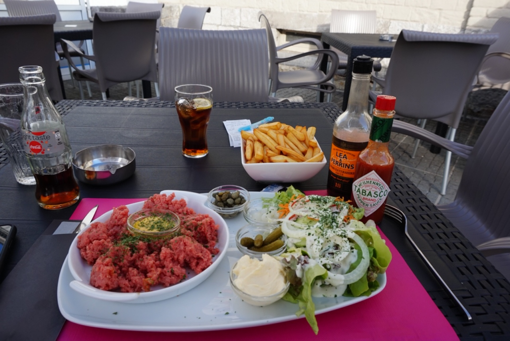 Just time to nip across the road for a hard-earned local beer and dinner before turning to bed. I’m ashamed to say I’m not a French speaker, and (wrongly) assumed Filet Americain would be a Fillet Steak. How wrong I was – out comes an intimidating mountain of raw Steak Tartare. Quickly dispatched (think of the gains) and time for bed. A good day’s touring and I’m excited at the prospect of crossing another border tomorrow – this time Luxembourg!