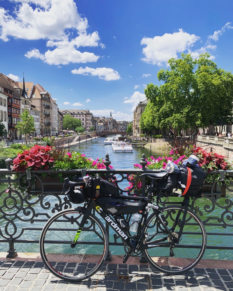 After a pleasant morning listening to albums I’ve neglected for years and clipping off the kilometres I arrive in Strasbourg – a grand and impressive city. Home to: florid hanging baskets, Amsterdam-esque bridges and waterways, the former EU parliament, and the jewel in the crown: Cathédrale Notre Dame de Strasbourg. Unbeknownst to me, I learn that this stunning Gothic cathedral was in fact the world’s tallest building for over 200 years (and even now remains the sixth tallest church in the world). To shameless quote Wikipedia, it has been “described by Victor Hugo as a “gigantic and delicate marvel”, and by Goethe as a “sublimely towering, wide-spreading tree of God””. Suffice to say, it’s an impressive and imposing spot!