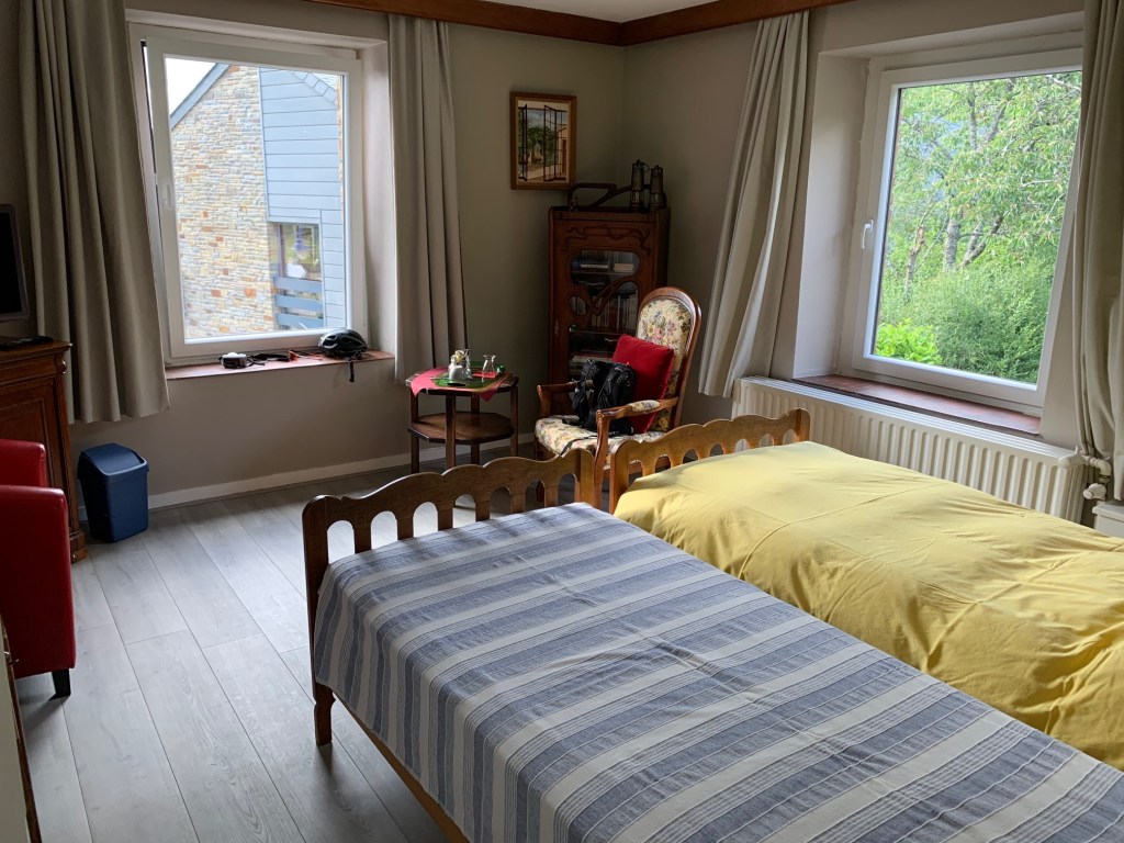 Now I’m aware cycle touring is about the journey and not, necessarily, the destination, but I must confess, I start to find the Eurovelo path a tad meandering. It picturesquely snakes along the banks of the Meuse, but progress is slow, and I soon decide to make a B-line for the Airbnb (and back into the unpredictable arms of Google Maps). This afternoon, however, it behaves admirably, leading me up interesting and attractive minor roads. After an initial couple of days without so much as a sniff of a gradient, I’m shocked to realise that The Ardennes is bloody hilly, and I’ve managed to choose accommodation the wrong side of an unnecessary chain of climbs! Despite the challenge of climbing with a laden bike, I enjoy the work, soak in the arborific views and arrive in the tiny village of Nassogne early evening to be greeted by JP, whose Airbnb room I’ll be staying in tonight. Simplistic, incredibly clean and well-priced, this is exactly the welcome I had hoped for.