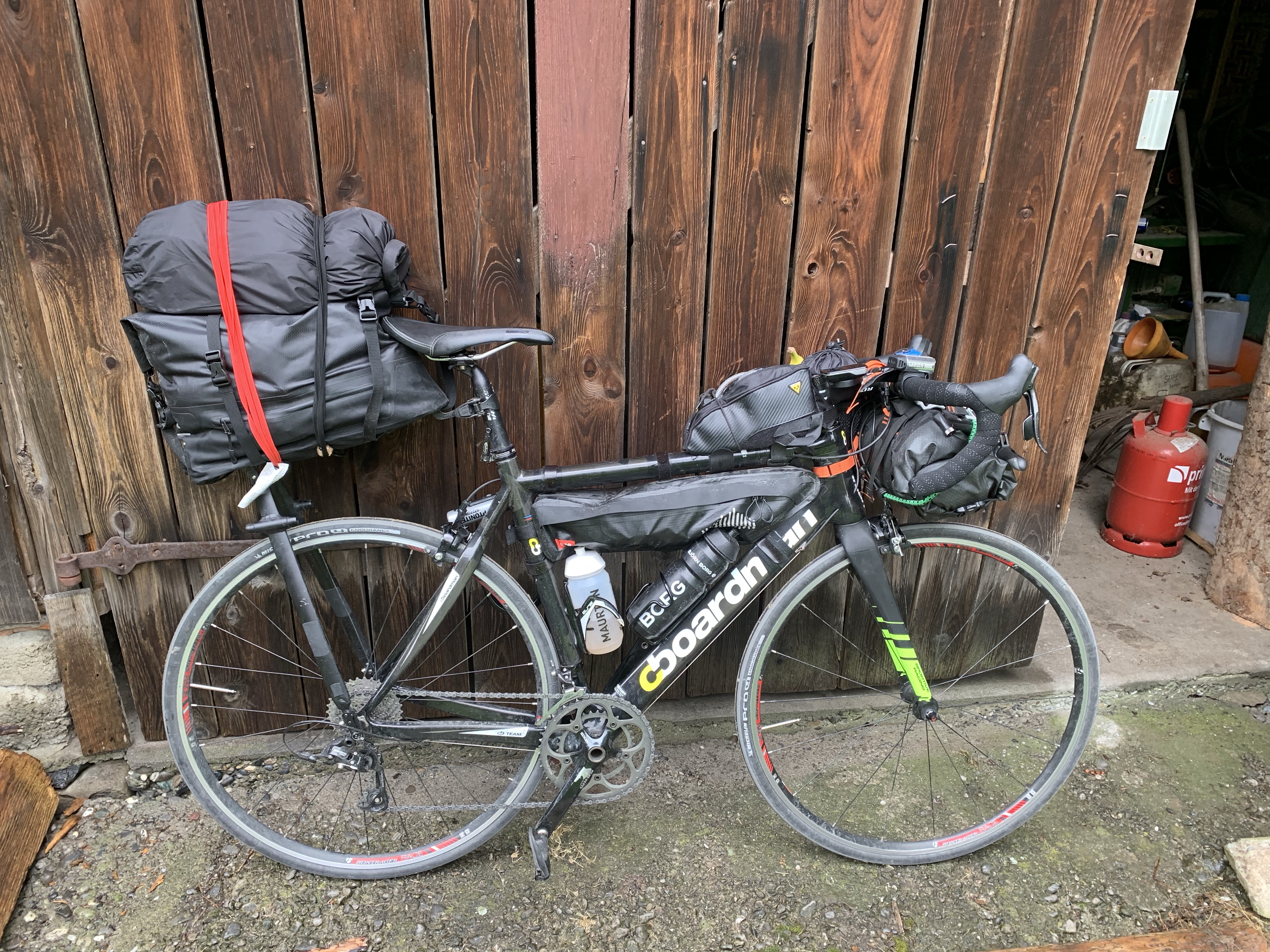 They say the best bike for touring is the one you already own. Stretching this adage to near breaking point, I’m tackling the journey on a 2010 Boardman Team Carbon, the budget carbon road bike I bought on Ride To Work as a placement student a decade ago. After 5 years collecting dust in the garage (relegated to the bench after I bought something shinier), she’s been serviced, fitted with 25 width tyres, saddled with bags, and will, like Lazarus, live again. As you can see, it’s far from a conventional arrangement – but as they say, “you dance with the girl you brought”. In the coming pages you’ll see how we fared together in tackling London to Budapest, via The Alps.