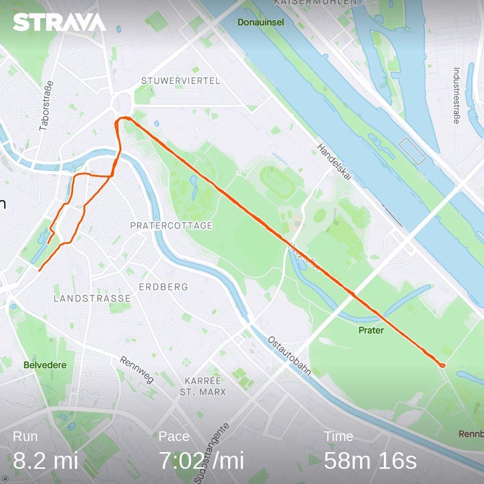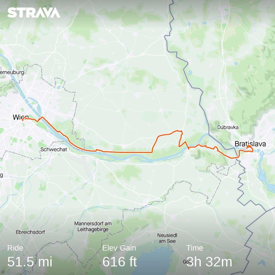 Upon reaching Prater it’s clear to see exactly why this was selected. Pan flat, perfectly straight, tree lined and closed to motorised traffic. Aside from the park’s historic relevance, it’s simply a beautiful place to go for a run. Those who watched Kipchoge will recall memorable scenes as he accelerated towards the line, beating his chest once he knew he was going to break the record. To my mind, this deserves a grand monument, but is instead memorialised by a spray-painted 1:59:40 across the road. Satisfied and grateful for having had the opportunity to soak up this little bit of running history, I head back to the hotel to pack and prepare for a spin toward the unknown: Bratislava.